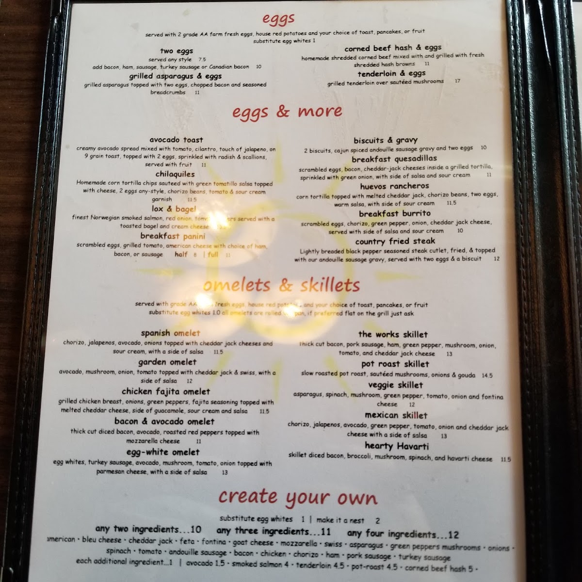2 farm fresh eggs, chorizo, jalapeƱos, avocado, green pepper, tomato, onion and pepper jack cheese with a side of salsa. comes with house red potatoes and you choice of toast or pancakes.