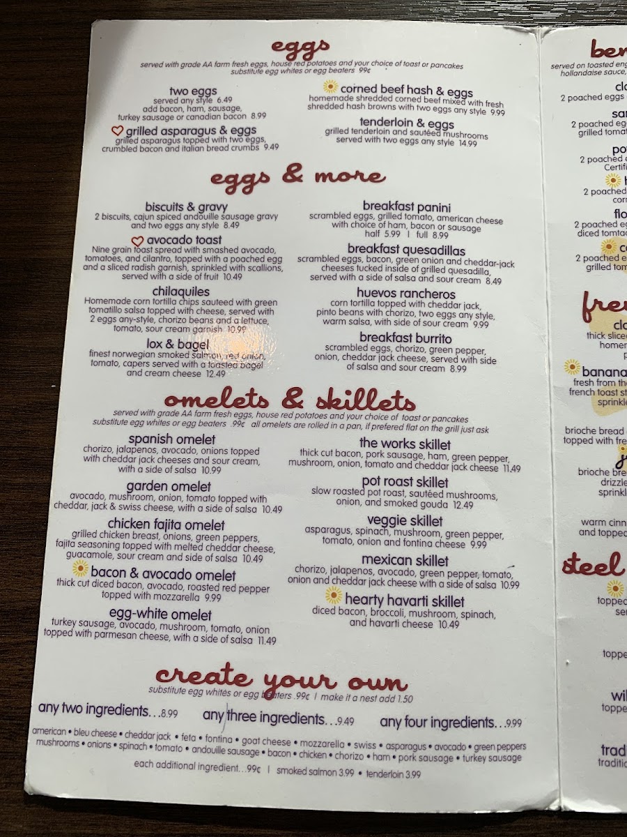 grilled asparagus topped with two eggs, crumbled bacon and italian bread crumbs. served with grade AA farm fresh eggs, house red potatoes and you choice of toast or pancakes.